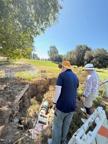 Larry Cloud (L), president of Penmar Golf Club (PGC), and Bjorn Eriksson (R) check out water pipe repair work near the 5th tee of Rancho Park Golf Course during PGC's annual 18-hole event at the famed course in West Los Angeles, just south of UCLA-Westwood. Winners of the former LA Open held at Rancho Park GC include Arnie Palmer, Charli